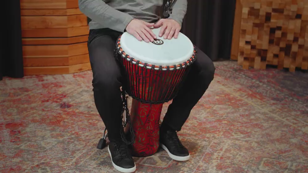 The MEINL Rope Tuned Travel Series Djembes are great drums for everyone from professional musicians to drum circles and recreational players. The patented synthetic construction is used to create a djembe that is ultra-lightweight. At 20% lighter than our fiberglass series djembes, these drums are a great choice to carry to your next gig or on a hike. The hand selected goat skin heads produce the traditional slaps and warm bass tones found in traditional African drums.
