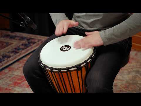 The hand carved shells feature a gouged surface reminiscent of sun-dappled water. This texture makes the djembe easy to grip between the knees. Hand selected goat heads are secured by the traditional Mali-weave system and runners of pre-stretched nylon PP rope.